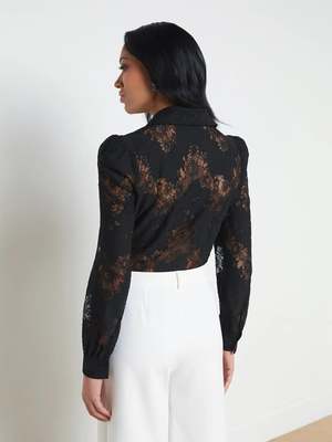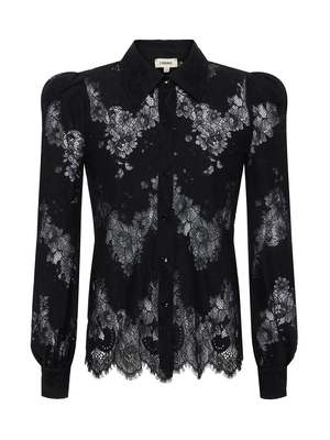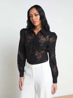 The Jenica blouse, L'agence's most feminine button-down shirt, is now offered in chic black lace. Its puff shoulders create delicate volume, while the structured collar adds definition. It can be worn with jeans or tailored trousers for a perfect romantic look from morning to night. Description: - Straight fit. - Button-front closure. - Contrast shirt collar and cuffs. - Puff shoulders. - Sheer. - Body length: 24.5" from shoulder to hem. - Sleeve length: 25.5". - Color: Black. - True to size. - The model is 5'9" (Bust: 32", Waist: 24", Hips: 35") and wears a size XS. - 68% nylon, 32% cotton. - Dry clean only.