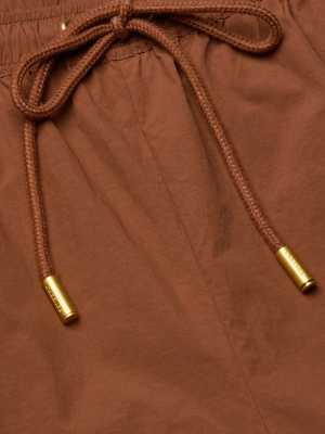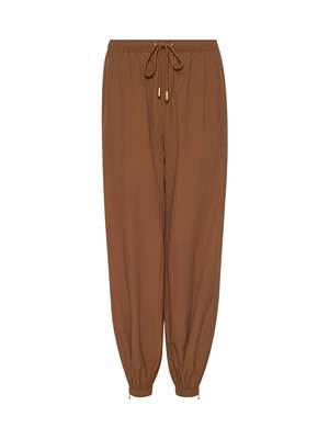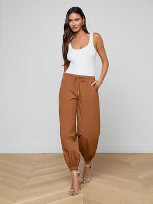 The Mariko by L'agence is a modern jogger pant with an elegant, refined fit. Crafted from lightweight nylon with a water-repellent finish, it offers easy sophistication for everyday wear. Description: - Mid-rise elastic waistband with drawstring - Relaxed ankle-length leg - Elastic hem with side zip - Side pockets Measurements: - Rise: 11 in / 28 cm - Inseam: 26 in / 71 cm - Leg opening: 4.6 in / 11.7 cm Color: Fawn. - True to size. - Model is 5'10" with a 32" bust, 23.5" waist, and 34.5" hips, and is wearing size XS. - 100% nylon. - Dry clean only.