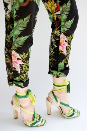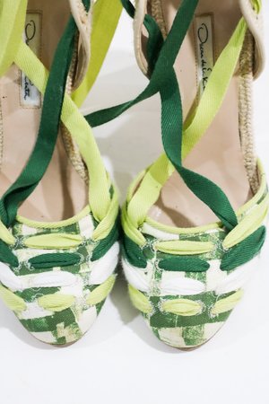 Espadrille pumps from Oscar de la Renta. Designed with a vibrant print, raffia heel, leather insole, and versatile ankle ties. Heel Height: 4.5" Material: Cotton + Leather + Raffia Rating: 8/10 - Minimal signs of wear.