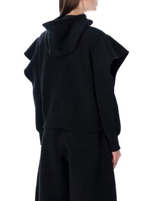 Women > Clothing > Fleeces & Tracksuits > Fleeces The Sacai Hooded Zip Sweatshirt reflects the brands signature hybrid and experimental approach. Crafted from fleece, it features a structured silhouette with sculpted shoulders and clean, functional details. The front zip closure with a double slider and the adjustable drawstring hood provide comfort and versatility, while the side pockets add a practical utility touch. A contemporary piece designed to elevate modern urban looks. - Fleece construction - Adjustable drawstring hood - Front zip fastening - Side pockets - Long sleeves - Modern, structured fit Alessandra is 1.75 m and wears size 2. Composition: 62% cotton, 38% polyester.