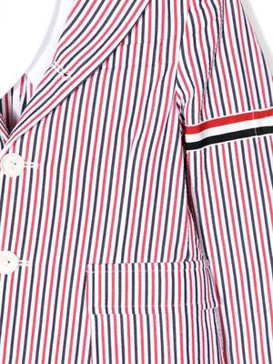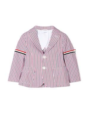 This patch pocket sport coat with RWB armbands in seersucker stripe is crafted from 100% cotton. Made in Italy.