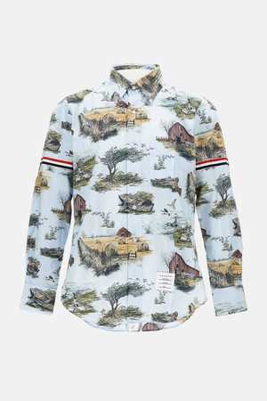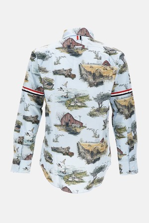 Men > Clothing > Shirts Made from 100% cotton. Front button closure. Buttoned cuffs. Patch pocket on the chest. Pleated details and graphic print with bucolic motifs. Light blue color. Composition: 100% Cotton
