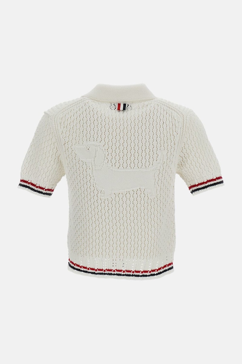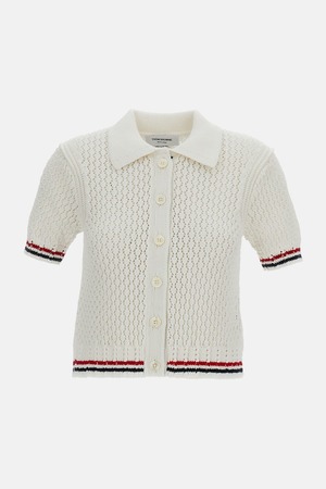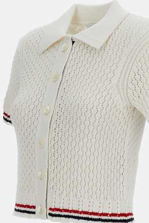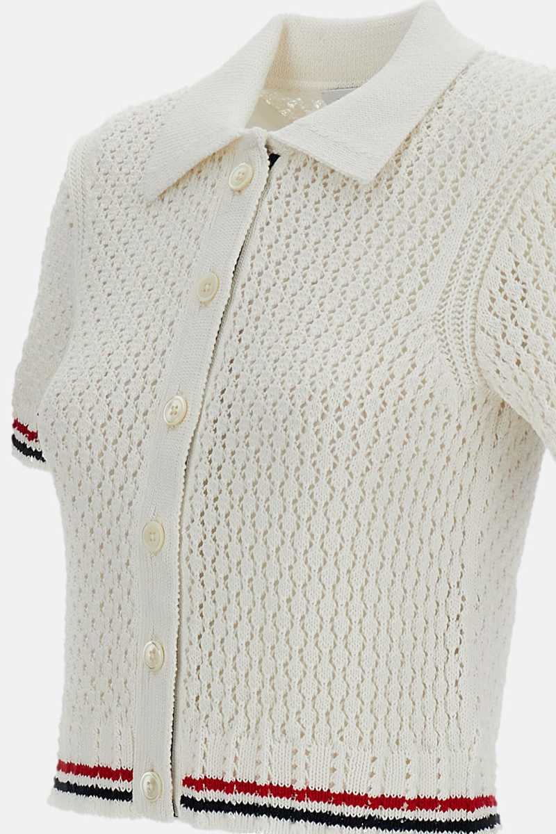 Women > Clothing > Topwear > Blouses Short-sleeve cardigan in pointelle cotton. Short, boxy cut with a regular fit. Pointed polo collar. Full central button placket. Tricolor grosgrain trims on edges and sleeves. Color: White. Composition: 100% Cotton.