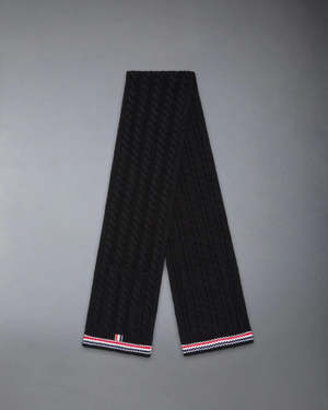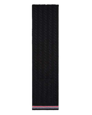 The Cashmere Baby Cable Stitch RWB Stripe Pocket Scarf by Thom Browne is a striking scarf featuring a cable stitch knit in pure cashmere, RWB bands, and the signature grosgrain loop tab. Perfect for layering. - 100% Cashmere - Made in Italy - Style: UKS023A-Y2001-001 - Type: Scarves