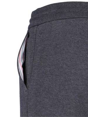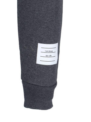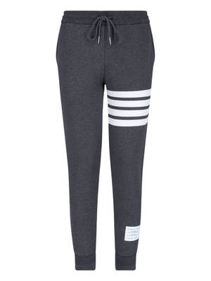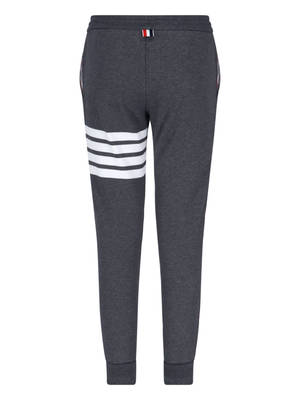 Thom Browne 'Loopback 4-Bar' dark grey cotton track pants with a mid elastic waistband, drawstring closure, white band print on the front, two side pockets, white side logo2 label, tricolor grosgrain tab at the back, elastic details at the hem, and straight leg. Composition: 100% Cotton.