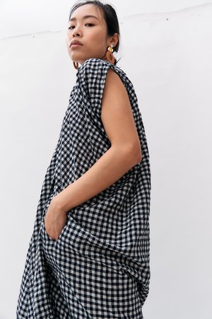 Zero Maria Cornejo's cocoon shirt dress features a fun gingham print, cap sleeves, a modest v-neck, zipper, snap placket, and two hidden pockets. Material: 73% Cotton + 27% Viscose Rating: 7/10 - Some signs of wear. Missing a snap closure on the snap placket. MEASUREMENTS (flat) Bust: 18 in Waist: 18 in Hip: 20 in Pit-to-Pit: 24 in Length from shoulder: 43 in Arm Hole: 7 in MODEL MEASUREMENTS Bust: 32 in Waist: 25 in Hip: 34 in Height: 5'7"