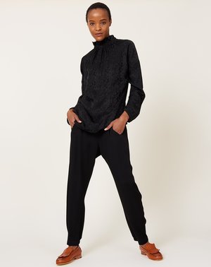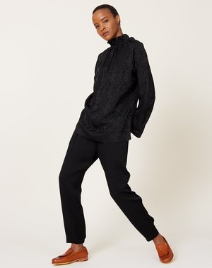 Zero + Maria Gabi Trouser in black Eco Drape. Sustainably-sourced viscose trouser feature hidden pockets on curved front seam and elastic detail at back cuff. Elastic waist, slips on. Eco Drape was developed using viscose yarn manufactured from a mixture of Norway Spruce and Scots Pine wood pulp, sourced out of sustainable forests in Domsjo, Sweden. Free from genetically modified trees or crops and forbidden chemicals, in its manufacturing or in the way that it is dyed. Fit: True to size Material: Viscose, acetate Origin: New York, New York Care: Dry clean only without PERC Model: Dora (5'8", 22" waist, 34" hip, 32A) wears a size 4 Why we Covet: Fundamental geometric shapes transformed into unexpectedly sophisticated garments Shown here with: Zero Maria Cornejo Ram Gaban Top in Disco Jacquard, Martiniano Duccio in Saddle