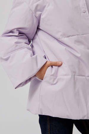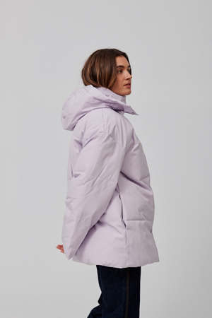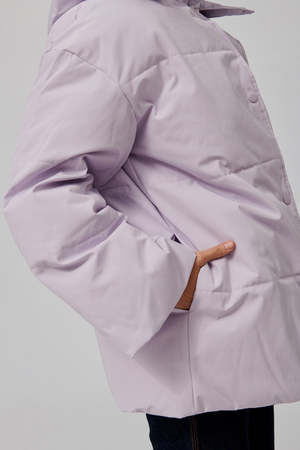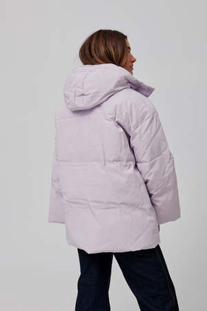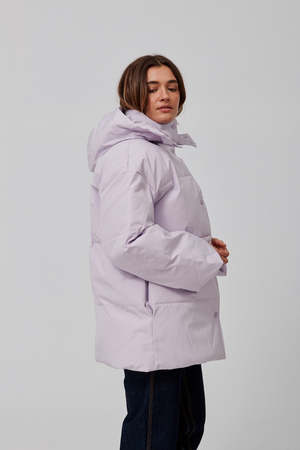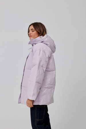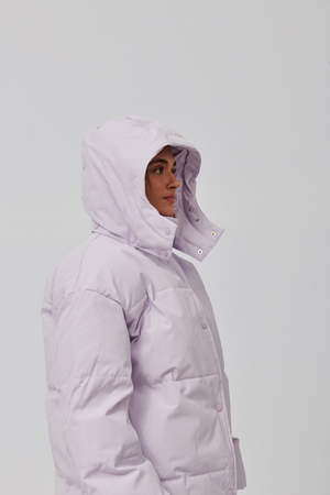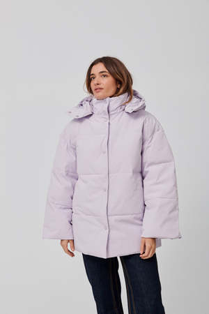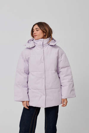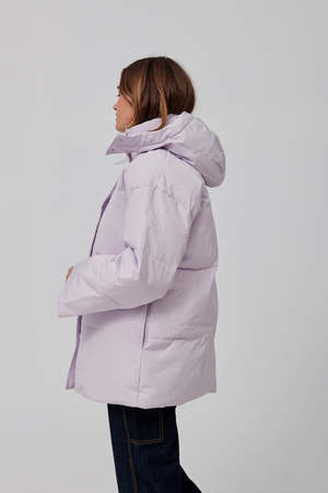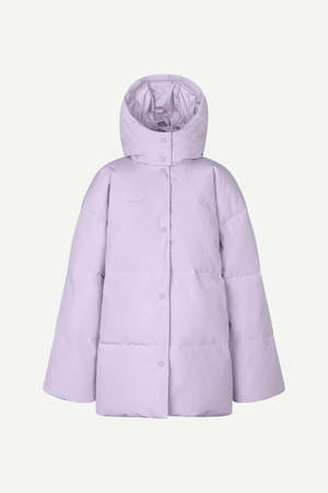 Easy fitting padded and quilted hooded jacket with dropped shoulders and wide sleeves. Press button front fastening, drawstring hood. Recycled polyester and organic cotton blend fabric, waterproof and windproof. Lining: 100% polyester // Shell: 83% recycled polyester, 17% organic cotton. Model is wearing size small.