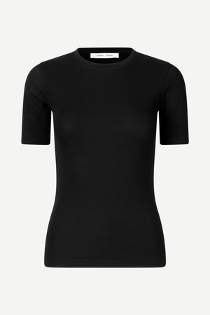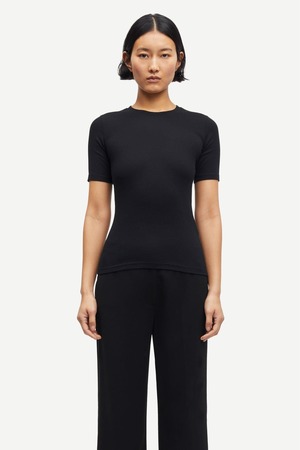The Saalexo T-shirt from Samse Samse is the tee that every closet needs. It has a slim-fitting silhouette with short sleeves, a crew neckline, and twin-needle stitch hems. The fine ribbed jersey fabric is made from organic cotton with added stretch elastane. - The high point shoulder length is 60 cm on a size S - The model is 177 cm and is wearing size S - 95% organic cotton, 5% elastane