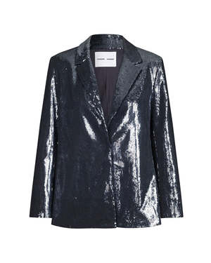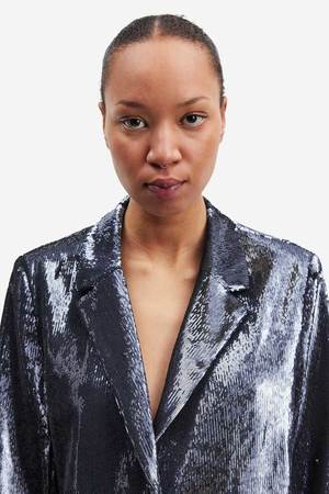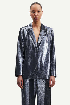 The Raven Blazer in Turbulence by Samsoe Samsoe is a single breasted sequined blazer featuring a notched lapel and inside pocket. Pair back to the matching trouser for a coordinated set. - Lined - Our model is 181 cm tall and is wearing size small. - Sleeve lining: 52% Polyester, 48% Viscose Lining: 90% Polyester, 10% Elastane Shell: 70% Polyester, 30% Recycled Polyester