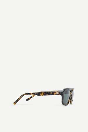 Unisex aviator sunglasses with tinted lenses. Thin frame made from 100% Acetate Renew with branding at the temples. Includes case and cloth with Samse Samse branding. Width (edge to edge at widest point): 14 cm. Height of lens (top to bottom at widest point): 4.2 cm. Height of temple (arm width at side): 1.1 cm.