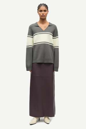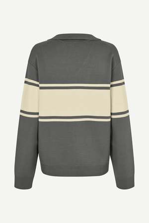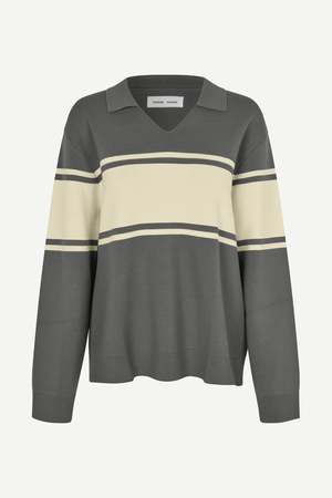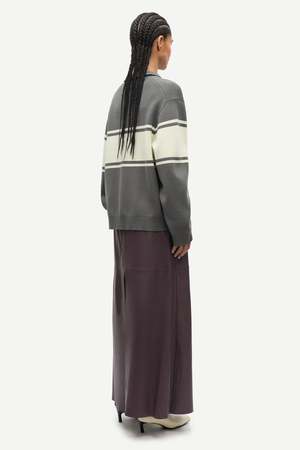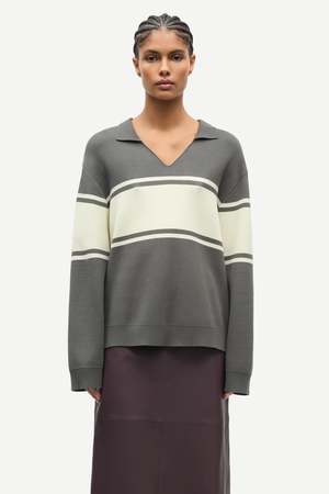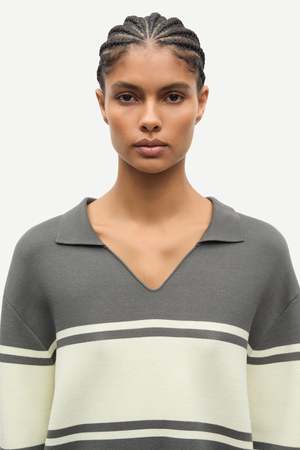 Sweater with polo details and dropped shoulders. Polo collar, rib-knitted cuffs and hem. V-neck. Striped pattern. Main material made from an elastic blend including LENZING ECOVERO viscose. Fit: Oversized fit, you can size down comfortably or stay true to size for a loose fit. The model is 175 cm and is wearing size S. Composition: 67% LENZING ECOVERO viscose, 25% polyester, 8% elastane. Care: Machine wash in cold water, lay flat or hang to dry. Made in China.