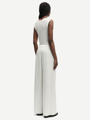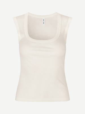 The Sadou Tank Top, a wardrobe essential from Samse Samse, is made from a soft, fine ribbed TENCEL (lyocell) and wool blend fabric. It has a sleeveless, slim-fit silhouette with a square neck design that elevates this everyday essential. TENCEL is a highly sustainable fiber made from wood pulp from certified, sustainably managed forests, using an environmentally friendly closed-loop production that recycles nearly all water and solvents, resulting in less energy and water use than cotton. The fibers are biodegradable with low CO impact. The model is 175 cm and is wearing size S. Details - Jersey tank top - Square neck - Sleeveless - Rib-knitted fabric - Slim fit - Egret color Fabric & Care Composition: 70% TENCEL Lyocell, 30% Wool. Care: Hand wash. Do not bleach. Iron at low temperature. Do not tumble dry. Dry flat. PCE only. Wash on wool cycle or by hand in lukewarm water, using detergent for delicates.