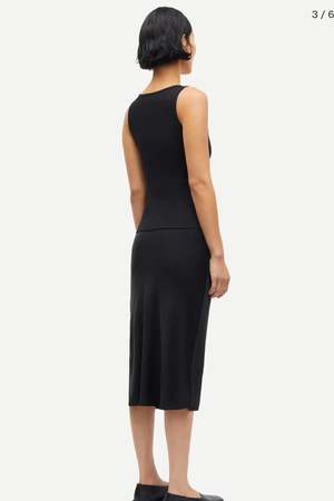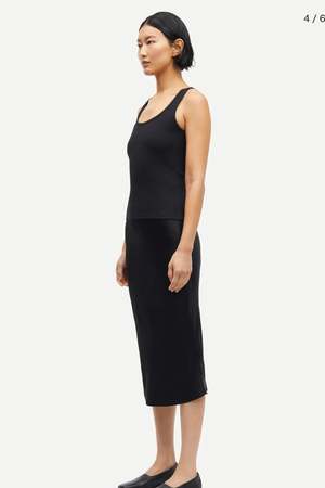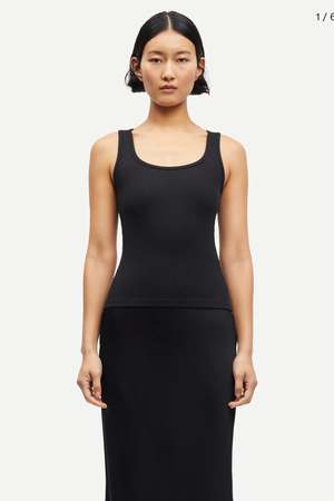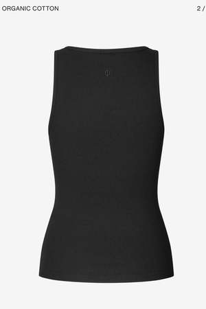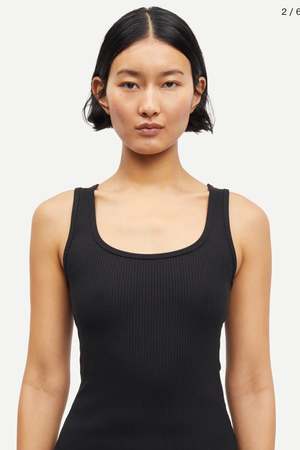 Slim fitting jersey vest top with a wide scooped front neckline and a high back neck. Ribbed jersey fabric in an organic cotton and stretch elastane blend. The high point shoulder length is 56.5 cm on a size S. The model is 180 cm and is wearing size S. This product contains 95% GOTS-certified organic cotton (Organic Cotton certified by Control Union 1009799). Material Main material: 95% Organic Cotton, 5% Elastane. Wash & Care 30 degree (normal) Do not bleach Iron at low temperature PCE only Do not tumble dry Max 10% shrinkage Style no. F10000006 Type: Clothing