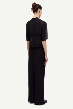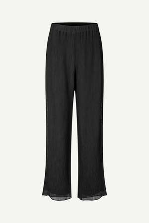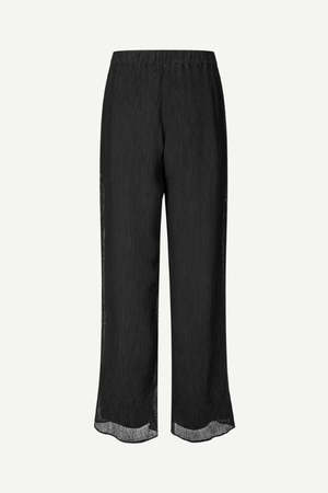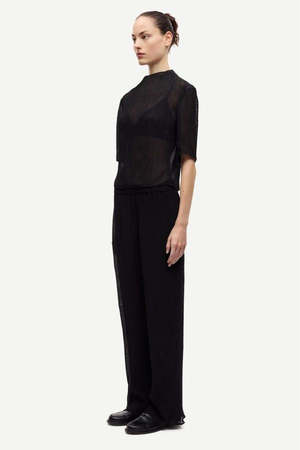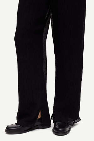 Mid-waist pants with a loose fit and flared leg. Elasticated waistband. Slits at the cuffs. Fully lined. Main material made from 100% recycled viscose. The model is wearing size S.