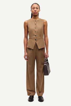 Mid-waist trousers with a straight leg, button and zipper closure at the fly, and an elasticated waistband. Side slit pockets on the front. Main material made from a lightweight and smooth wool and recycled polyester. Fit: True to size, take your usual size. Model wears S. The inner seam length is 80.5 cm on a size S. Composition: 55% Recycled Polyester, 45% Wool Care: Hand wash in cold water. Lay flat or hang to dry.
