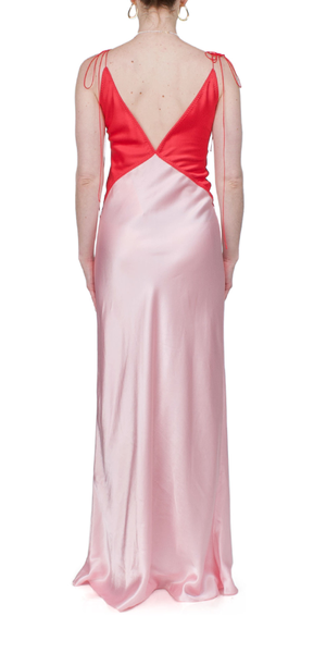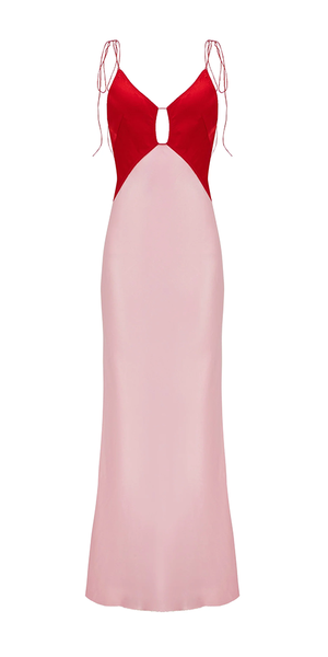 Elevate your style with the Terrin Satin Gown by Anna October. This chic gown hugs your curves and features a deep-set neckline and modern cut-out design. With a refined, bold color palette, this gown is perfect for cocktail and black tie events. Details: - Color: Red/Light Pink - 57% viscose, 43% polyester - Self tie shoulder straps - Vendor Code: SS2508 - Fits true to size - Model is 5ft 5in and is wearing a size XS
