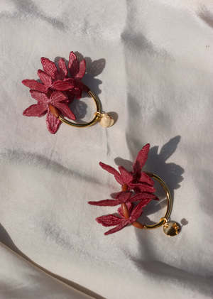 Kui earrings feature hand-dyed floral lace, plated brass components and wooden beads. Available in a wide variety of colors inspired by the botanical world. Colors include shown beige, desert rose (dusty pink), magenta, coral, terracotta, mustard (ochre), light yellow, black, white, navy, light blue, burgundy, teal and moss green. Come on hypoallergenic gold plated 316L stainless steel locket posts, with butterfly backings. (Clip-on, gold fill ball posts or gold fill hooks available here but will alter the aesthetic.) The earrings are approximately 7cm long. The hoop measures approximately 4cm in diameter. Each earring weighs 5.4 grams. The pair weighs 10.8 grams in total. Care Instructions: Use an iron on soft or flat iron (hair) on the petals to enlarge/reshape the flowers. Clean white lace stains with stain removers such as Tide-to-go or Shout wipes. Handmade with love in our Montreal studio. Limited edition due to vintage and exotic sourcing of materials.