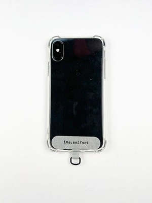 This phone necklace features an elastic band threaded with 10mm wooden beads finished with vegan, non-toxic varnish. It includes a brass chain, certified sustainable wood (FSC), a metal ring and clasp, and comes with a grey adapter for use with any phone case. Length is approximately 120cm. Handmade in Berlin.