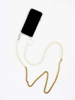 This phone necklace features an elastic band threaded with 10mm wooden beads finished with vegan, non-toxic varnish. The design includes a brass chain, certified sustainable wood (FSC), a metal ring and clasp, and comes with a grey adapter for use with any phone case. Length approximately 120cm. Handmade in Berlin.