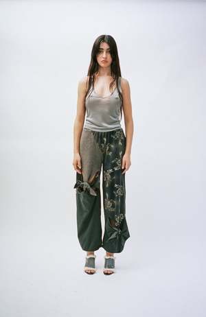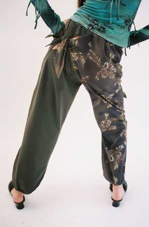 Stretch cotton jersey and knit stretch wool trousers. Cutouts with self-tie fastening and graphic pattern printed throughout. Paneled construction. Elasticized waistband. Single welt pocket. Concealed bungee-style drawstring at cuffs. Full viscose twill lining. Ultimate comfort. The print was developed with a contribution from an Uzbek artist, is inspired by vintage Soviet-era fabrics, and is printed direct-to-garment. Worn with the Turquoise Printed Long-Sleeve.