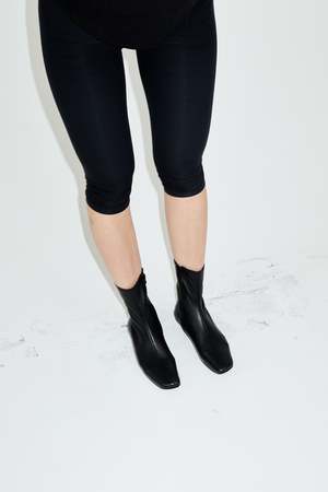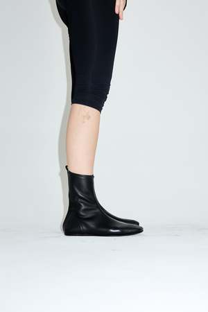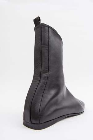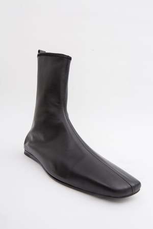 Diagonal ergonomic point flat ankle boot from Dubie. Made in soft nappa leather, the narrow silhouette adapts to the wearer and feels like a sock. DETAILS + FIT - Nappa leather upper - Leather sole and insole - Unlined - Heel height 0.8 cm - Fits true to size; IT 37 = US 7 - Made in Argentina Dubie's shoes are made to move, to adapt to your feet. Conceived as a second skin, they fit like a sock. Wear till exhaustion.