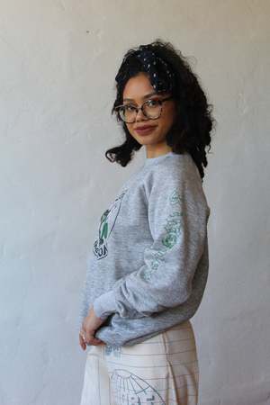 1980s dark heather grey sweatshirt screen printed by us in Long Beach, CA with our Flower of the Dragon graphic on the front, 3 Women script in green down the sleeve. One of a kind Label FL Robinson | Made in the USA | Acrylic, Poly, Cotton Blend | Size Medium Measurements Chest 40 | Length 27 Condition Vintage sweatshirts used may have imperfections Model is 5'2, size 4-6 for reference.
