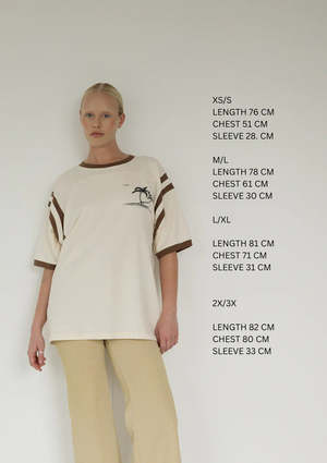 The Tourist Tee by Bohme Goods is inspired by 1960s Jersey, with a relaxed, oversized fit and an exaggerated drop shoulder. It features contrast sleeve cuffs and a Club Bohme graphic on the chest. - 100% Cotton - Designed in Canada - Made in Shenzhen, China Measurements: XS/S: Length 29.92"; Chest 20.08"; Sleeve 11.02" M/L: Length 30.71"; Chest 24.02"; Sleeve 11.81" L/XL: Length 31.89"; Chest 27.95"; Sleeve 12.20" 2X/3X: Length 32.28"; Chest 31.50"; Sleeve 12.99"