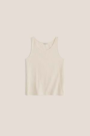 The Tomaso Tanktop is a sleeveless style with a wide, scooped neckline, generously cut armholes, and a relaxed fit. It is crafted from soft off-white cotton jersey with a rib structure and delicate openwork detailing, creating a breathable, pointelle-like pattern.