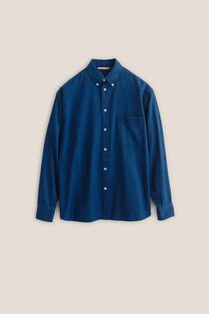 The Banita Button Down Shirt is an oversized, vintage-inspired button-down featuring a curved hemline, patch pocket, and adjustable cuffs. This cotton fabric is woven in a classic plain weave, offering a smooth and breathable texture. The soft indigo tone carries subtle depth and richness, while a gentle wash lends it a relaxed, vintage-inspired handfeel.