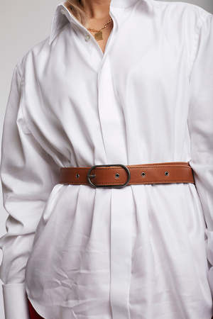 Vegan leather belt from Matt & Nat in Camel. Oval metal buckle. Adjustable length. Five notches. - Vegan leather - Width: 1