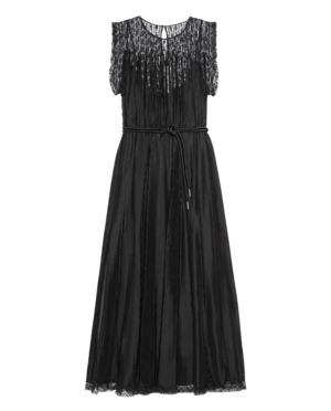 Elegant and ethereal, this lace column dress is detailed with silk godets for gentle movement and texture. Sleeveless with a crew neckline and delicate silk binding, it hits just above the ankle and comes with a skinny satin belt for optional shape. Fully sheer with removable slip, it's a timeless piece made to treasure. Fabric: 55% Nylon, 45% Silk Lining: 100% Viscose Dry clean only Imported Measurements: Model is 5'10" wearing a size Small.