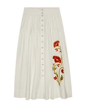 Cut from a fluid, drapey twill, the Western Embroidered Highland Skirt features a dropped waist with soft pleating and a flowing hem for effortless movement. An elastic waistband offers ease and comfort, while a full front placket is finished with classic Western pearl snaps. Ornate Western embroidery cascades down the front panel, adding a graphic, heritage-inspired touch. This season, the skirt is made in collaboration with Stetson, whose legacy of authentic craftsmanship has defined the spirit of the West since 1865. Born from a shared love of the heritage and craftsmanship of the West, the Stetson & THE GREAT. collaboration celebrates timeless pieces that are made to last for years to come. - 75% Rayon 25% Nylon - Dry clean only. - Imported