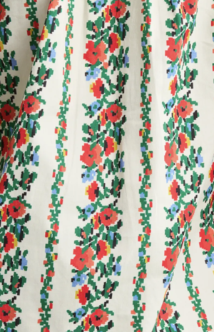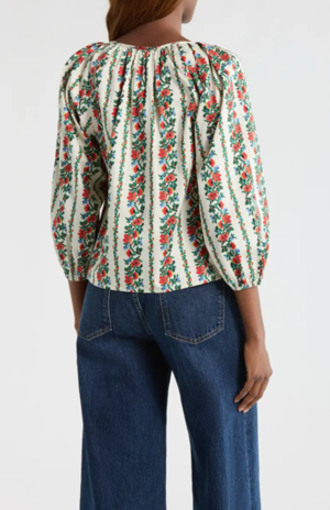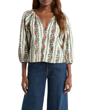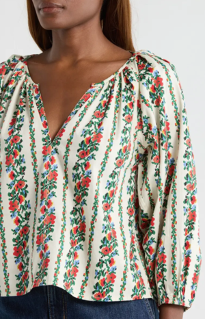 Rows and rows of colorful blooms romance a sweet cotton top offered with gently gathered sleeves. - Split neck - Long sleeves - 100% cotton - Hand wash, line dry - Imported