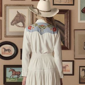 Made in collaboration with Stetson, whose legacy of authentic craftsmanship has defined the spirit of the West since 1865, the Embroidered Western Shirt channels the charm of a treasured 1940s rodeo find. The shirt is detailed with red Western floral embroidery and piped finishes that frame the silhouette. Classic Western chest pockets add a nostalgic, heritage-inspired touch. The fit is boxy and relaxed, balanced by tailored elements like a crisp shirt collar and traditional Western sleeve cuffs that bring structure to the easy shape. Style it tucked into the matching Western Embroidered Highland Skirt for a coordinated look. Born from a shared love of the heritage and craftsmanship of the West, the Stetson & THE GREAT. collaboration celebrates timeless pieces that are made to last for years to come. - Main self: 75% rayon, 25% nylon - Contrast: 85% cotton, 15% linen - Dry clean only - Imported