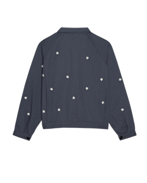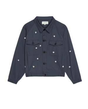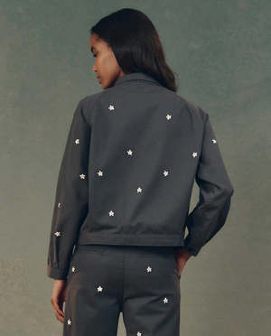 Inspired by a 1950s mechanic uniform, this classic workwear-style twill jacket blends vintage charm with modern ease. Designed with a relaxed fit, slightly cropped silhouette, and rounded shape, it features raglan sleeves, front patch pockets, and subtle pleats tucked into the waistband. Crafted in LA from structured cotton twill, it's finished with an all-over embroidered daisy motif for a playful yet timeless touch.