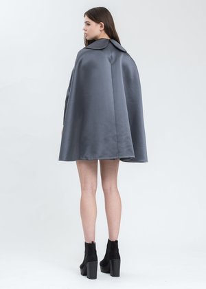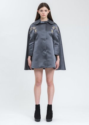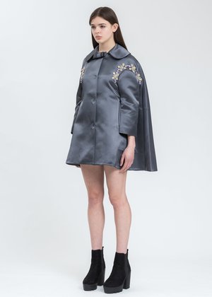 Long sleeve viscose-blend coat in grey. Features bow detailing at the rounded spread collar. Hidden press-stud fastening across the front face. Welt pockets at the waist. Crystal detailing along either shoulder. Finished with a pleat along the spine, and tonal stitching throughout. Body: 60.5% Polyester, 39.5% Viscose Lining: 100% Polyester Imported Model is wearing a size 6 Model is 5'7" (172 cm), 98 pounds (44kg), usually wears S in tops. A size 25in denim and S in trousers. Size 8 in shoes.