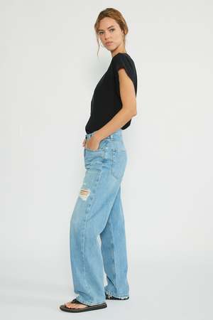 Low slung and slouchy, this style is inspired by 90s loose fit jeans. Fit is roomy, never bulky, sitting comfortably on the hip with menswear sized pockets and deep pocket scoops. A soft fluid denim adds a feminine drape. Fit: 11.75" Rise 31" Inseam 17.5" Leg Opening Model wears a size 26. SIZE CHART Care & Content: Machine wash cold with like colors. Line Dry. Do not bleach. Warm iron if needed. 75% Cotton, 25% Refibra Tencel Sustainability: - Made with Refibra, an upcycled cellulose fiber made from recycled cotton. - Low impact wash process uses 90% less water, 70% less energy and only clean chemical alternatives. - Hangtagss, labels and packaging made entirely from recycled and biodegradable materials. Learn more about sustainability and social responsibility here.