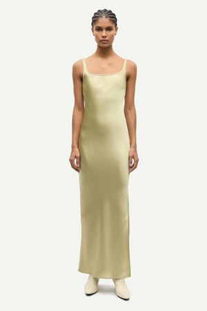 Bias-cut satin maxi dress with a slim fit and a side slit. Main material made from 100% recycled polyester. This product contains 100% GRS-certified recycled polyester certified by Control Union 1009799. 100% Recycled Polyester. Imported.