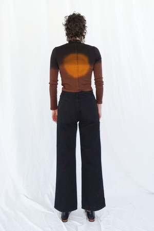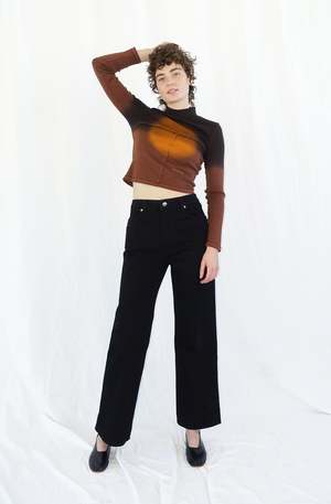 By Eckhaus Latta A classic high waisted four pocket jean with a wide leg. Back pockets are cut in signature "L" shape. Cut in almost black light enzyme washed denim. 100% cotton, made in los angeles. Unisex fit, female model wears size 27, male model wears size 31.