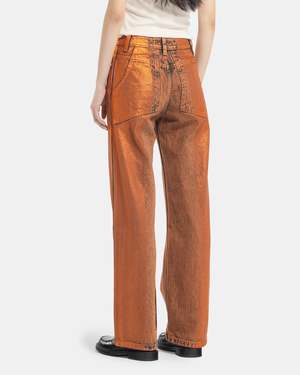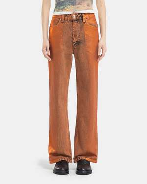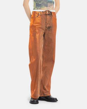 Eckhaus Latta Wide Leg Jean in Copper The Wide-Leg Jean is a high-rise pant with a cropped, straight-leg cut. The pair are crafted of non-stretch denim with a unique enzyme wash and citrine overdye process, finished with a distinguishing copper foil coating at the sides. The pair are complete with a zip-fly, silver-tone hardware, side pockets, and their signature L shape back patch pockets. - 100% Cotton. - Made in the USA. - Dry clean. Natalie is 5'8 (173cm) and is wearing a size 26.