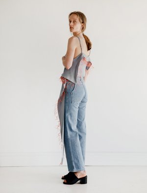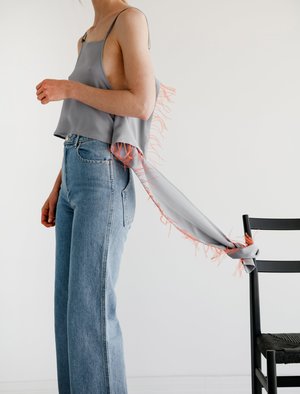 It's easy to stand out in the 'Flutter Blouse.' A mid-length silk tank with asymmetrical scarf panel featuring orange ostrich feathers. The panel sweeps around the backside of the top and drapes along the side of the body. Side zipper closure and adjustable straps. - Made in the USA - 100% silk - Feathers: Ostrich - Dry clean only - Megan is 5'10"; bust 32"; waist 25.5"; hips 36"; wears a size small