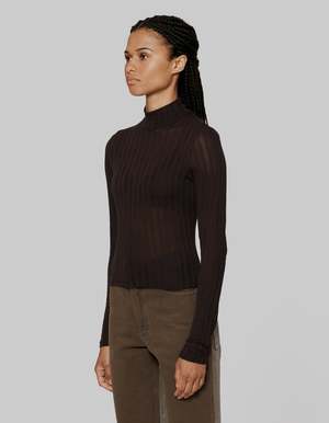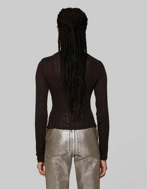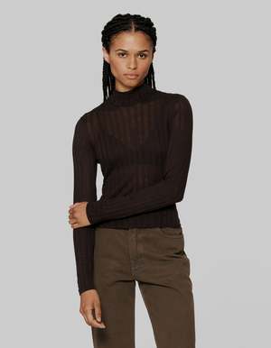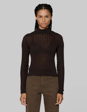 By Eckhaus Latta A classic slim fit turtleneck is cut in a custom fabrication. Knit density varies between opaque and semi transparent irregular vertical lines, giving a burnout effect. Models wear sizes small and large. 100% viscose. Made in Portugal.