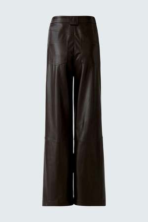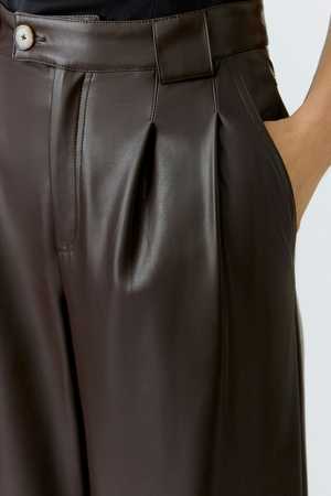 These wide-pleat pants from OUI FASHION feature a leather-look finish and distinctive knee seams that mimic real leather. Made from an ultra-soft polyester-elastane blend with a lightly brushed finish, they offer both elegance and comfort. Details: - High-rise waist with pleats and belt loops - Full-length wide leg - Zip fly with single button closure - Side slit pockets - Back yoke with patch pockets and distinctive topstitching - Inseam length for size 36 (S): 82 cm - Color: Dark brown - It is recommended to size down in this style Fit & Fabric: - Model is 178 cm tall and wears size 36 (S) - Shell: 100% polyurethane - Lining: 95% polyester, 5% elastane Care: - Delicate wash at 30 C.
