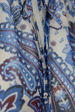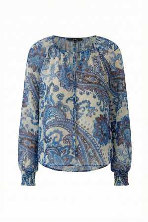 This lightweight bohemian blouse from OUI FASHION features a paisley print that pairs perfectly with jeans. Made from delicate, semi-sheer crinkled chiffon, this feminine style is ideal for elevating your spring outfits. Details: - Relaxed fit - V-neckline with drawstring tie - Long raglan sleeves - Elastic smocked cuffs with slight ruffle - Rounded hem - Length for size 36 (S): 62 cm - Color: Offwhite blue - True to size Model is 1.77 m (5'10") and wears size 36 (S). Fabric & Care: - 100% polyester - Delicate wash at 30 C