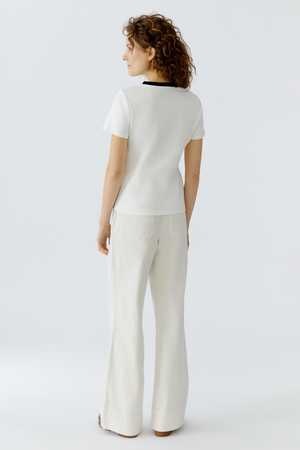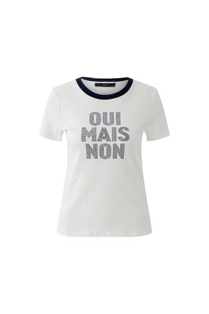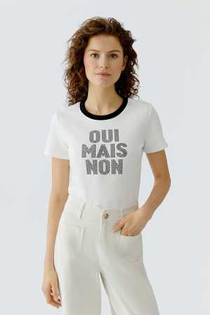 The "Oui Mais Non" T-shirt from OUI FASHION has a sporty collegiate look with contrasting rhinestone details. Made from pure cotton, this fun tee is perfect worn on its own or layered under a blazer for extra impact. Details: - Fitted silhouette - Contrast rib crew neckline - "Oui Mais Non" slogan entirely in rhinestones - Length for size 36 (S): 58 cm - Color: White and black - True to size - Model is 176 cm and wears size 36 (S) - 100% cotton - Delicate wash at 30C.