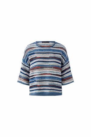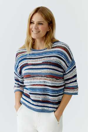 This mixed-knit sweater from OUI FASHION features irregular stripes with a 3D texture. Knitted in a seed stitch with micro-sequins for a subtle shine, it pairs perfectly with white jeans for a spring outfit. Details: - Relaxed fit - Crew neckline - Rolled edges at collar, hem, and cuffs - Milano-knit sleeves - Dropped shoulders - Length for size 36 (S): 48 cm - Color: Blue and white - True to size - The model is 177 cm tall and is wearing size 36 (S) - 50% cotton, 25% polyamide, 18% polyacrylic, 7% polyester Care: - Delicate wash at 30 C Type: Knit sweater