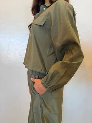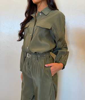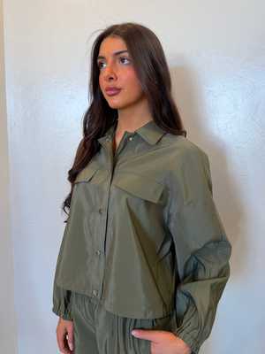 This utilitarian jacket from OUI FASHION features a relaxed, boxy fit with a slightly cropped length. It is designed with elastic cuffs and an adjustable drawstring hem for a customizable fit. Made from a lightweight, fluid satin-like fabric, it can be worn as a transitional spring-summer coat or as an indoor layer in cooler weather. Details: - Boxy fit - Button front closure - Slightly cropped length - Adjustable drawstring hem - Faux flap chest pockets - Elasticated cuffs - Color: Beetle - True to size Fabric & Care: - 100% Polyester - Delicate wash at 30 C Model Info: - Model is 5'8" - Usually wears XS and size 24 in jeans - Wears size 36 (S) in this style.
