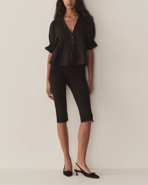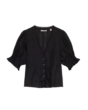 Crafted from a diaphanous ramie, the Edwardian-inspired Karlie Top features a plunging V-neckline adorned with ruffles and delicate clustered pintucks at the yoke, back, and short puffed sleeves. A line of starburst buttons runs up the center front. Wear it loose, or tuck it into your favorite high-waisted jeans. Fabric: 100% Ramie.