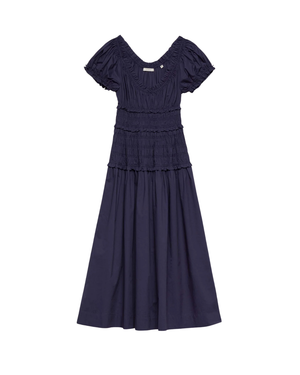 The Leanne Dress features a scoop neck, short sleeves, and rows of intricate shirring framed in dainty ruffles.